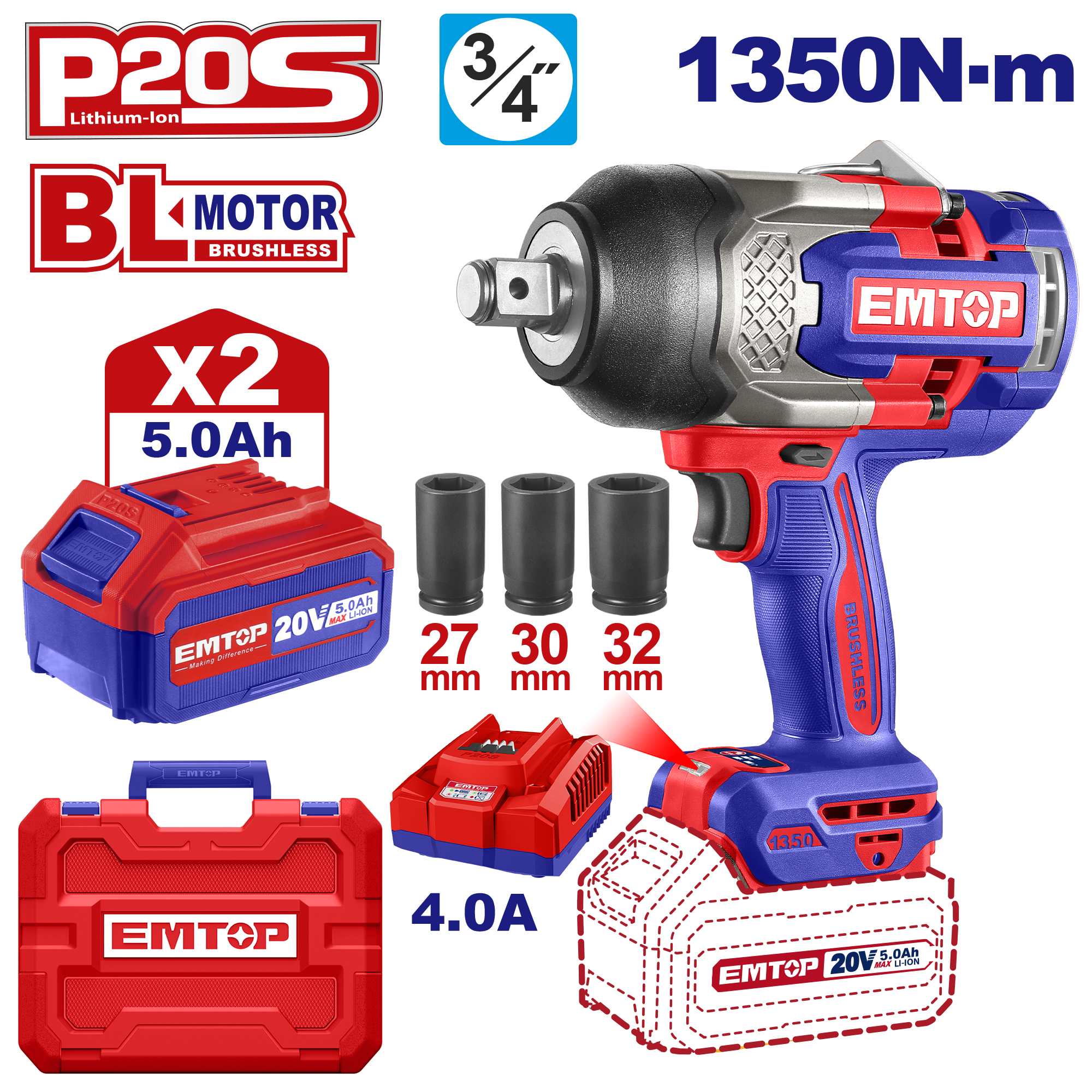 🔧 Clé à Choc Sans Fil EMTOP 20V Brushless 3/4″ – 1350 Nm – 2x Batteries 5Ah