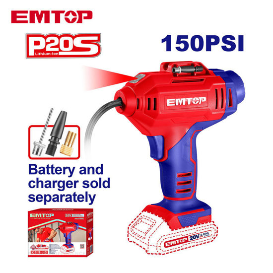 Conçu pour être pratique et rapide, ce compresseur EMTOP fonctionne avec une batterie 20V (non incluse) compatible avec tous les outils de la gamme EMTOP. Son écran digital permet un contrôle précis de la pression et un arrêt automatique dès que le niveau souhaité est atteint ✅.